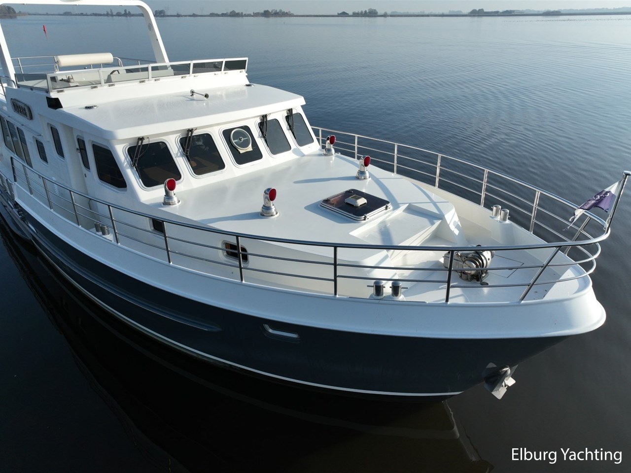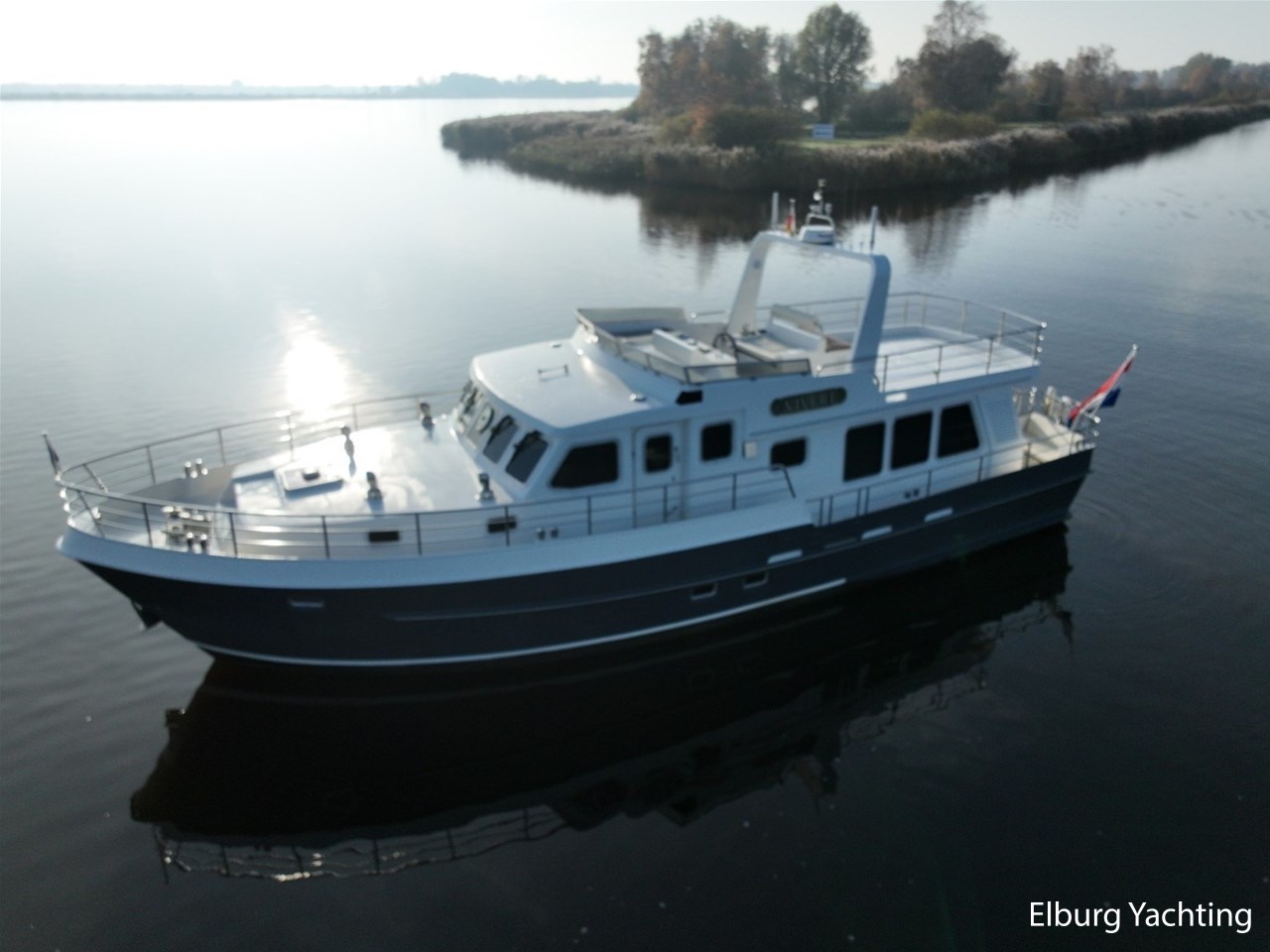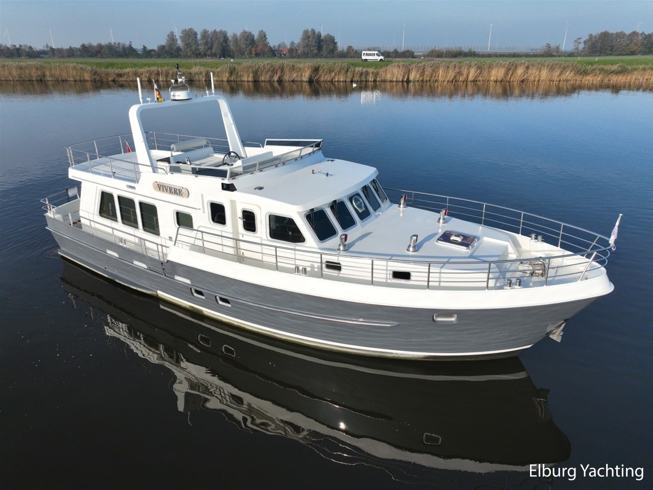 Het jacht kenmerkt zich door het robuuste ‘Trawler’ uiterlijk dat tot haar eveneens tot een breed inzetbaar jacht maakt. De dubbele John Deere motoren in combinatie met de DMS stabilisatoren zorgen voor een fijne vaarbeleving ook op de grotere watern. De doorvaarthoogte met de mast én de ramen op de flybridge naar beneden is ca. 3.45 meter waardoor de Franse kanalen bevaren kunnen worden.